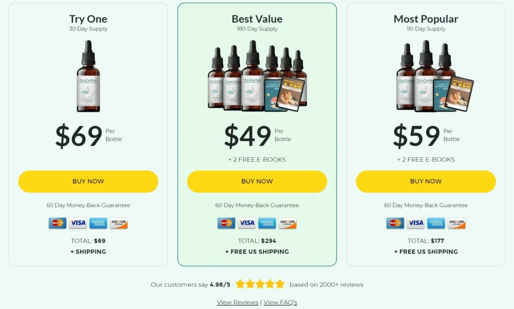 • Most Popular: 90-day supply, 3 bottles of ZenCortex – $59 per bottle (YOU SAVE $360) + 2 FREE eBooks